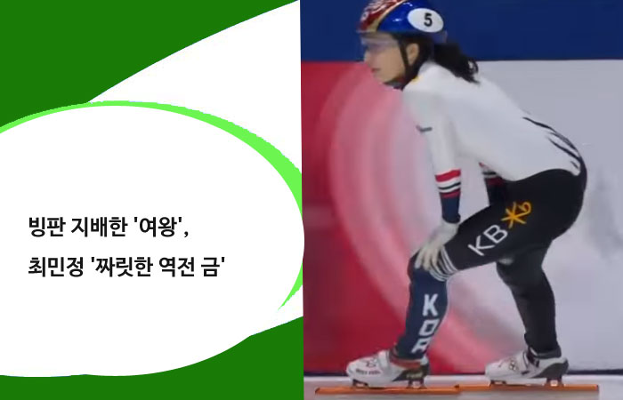 "빙속 여제" 최민정은 쇼트트랙 월드컵에서 그림 같은 역전극으로 금메달을 목에 걸었다. 같은 날 여자 배드민턴 복식에서는 한국 선수들끼리 결승전을 치르는 등, 대한민국 스포츠의 황금 주말을 완성했다.
