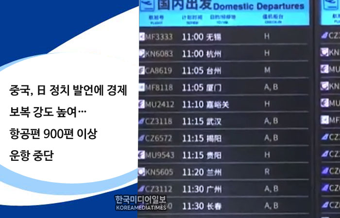 중국, 日 정치 발언에 경제 보복 강도 높여…항공편 900편 이상 운항 중단