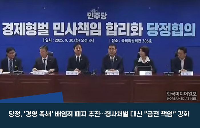 기업의 정상적인 경영 활동을 위축시키는 '족쇄'로 지적받아 온 형법상 배임죄가 폐지 수순을 밟는다. 더불어민주당과 정부는 배임죄의 형사 처벌 조항을 없애는 대신, 민사적 손해배상 등 금전적 책임을 강화하는 방향으로 법 체계를 전면 개편하기로 합의했다.더불어민주-정부 '경제형벌 민사책임 .. 김희원 기자 | 09-30 09:29 |