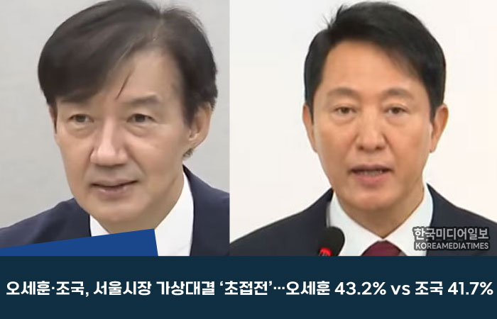 16일 여론조사기관 미디어토마토가 뉴스토마토 의뢰로 13~14일 서울 거주 만 18세 이상 성인남녀 1001명을 대상으로 실시한 조사에서, ‘범보수 진영 후보로 오세훈, 범진보 진영 후보로 조국이 출마한다면 누구에게 투표하겠는가’라는 질문에 응답자의 43.2%가 오 시장을, 41.7%가 조 위원장을 선택했다. 오차범위(±3.1%p) 내 접전 양상이다.