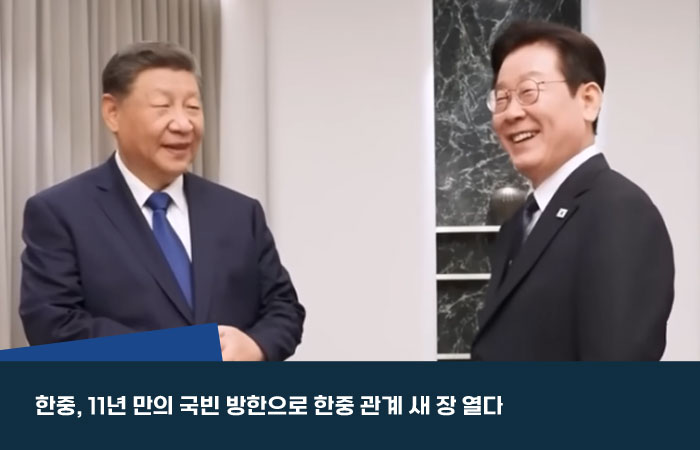 이재명 대한민국 대통령과 시진핑 중화인민공화국 국가주석이 11년 만에 국빈으로 한국을 방문한 시 주석과 취임 후 첫 정상회담을 갖고 양국 관계의 "전면적 복원"을 공식화했다. 경주에서 열린 이번 정상회담은 아시아태평양경제협력체(APEC) 정상회의 참석을 계기로 성사되었으며, 주한미군 사드(THAAD) 배치 이후 냉각되었던 양국 관계를 9년 만에 본궤도에 올려놓았다는 평가를 받는다. 97분간 이어진 회담은 한미 정상회담(87분)이나 한일 정상회담(41분)보다 길게 진행되어, 양국이 현안과 미래 협력 방향에 대해 깊이 있는 논의를 나눴음을 시사했다.