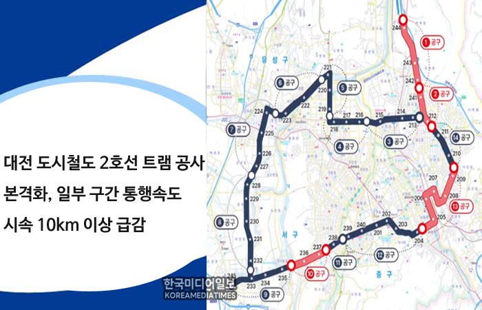 총연장 38.8km에 달하는 대전 도시철도 2호선 트램 건설 공사가 본선 14개 공구 전체 착공에 돌입한 가운데, 이미 공사가 시작된 일부 구간에서 극심한 교통 혼잡이 발생하며 시민 불편이 가중되고 있다. 현재 일부 공구에서 통행 속도가 시속 10km 이상 급감하는 현상이 나타나고 있으며, 내년 하반기 모든 공구가 본격화될 경우 대전 도심 전체의 차량 정체가 정점에 달할 것이라는 우려가 나오고 있다.