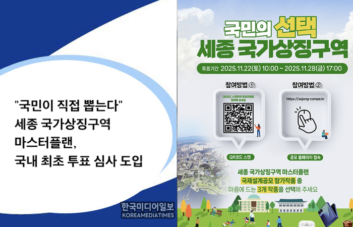 국회 세종의사당과 대통령 세종집무실, 대규모 시민공간이 들어설 예정인 국가상징구역의 마스터플랜(도시설계) 당선작 선정을 위해 오는 22일부터 28일까지 7일간 국민참여투표가 진행된다. 행정중심복합도시건설청(행복청, 청장 강주엽)이 도시 설계 과정에 국민의 눈높이와 소통의 가치를 반영하고자 국내 설계공모 역사상 최초로 도입한 혁신적 제도로서, 투표 결과가 심사 결과에 직접적으로 반영되는 전례 없는 방식이다.