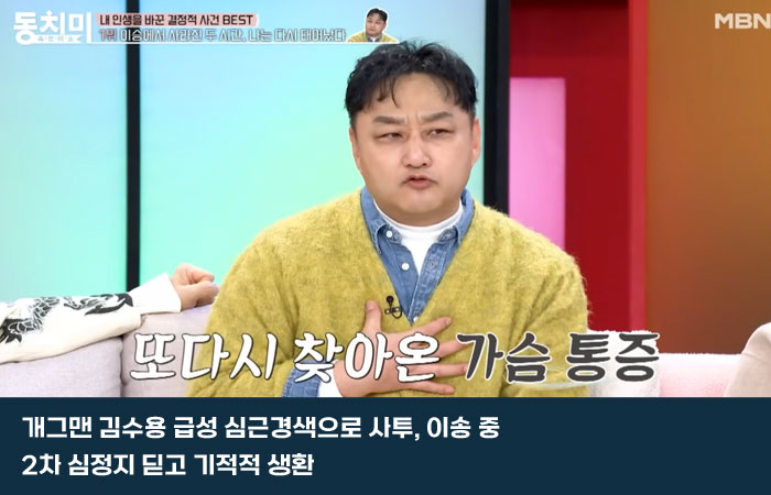 코미디언 김수용이 유튜브 촬영 중 급성 심근경색으로 쓰러져 생사의 갈림길에 섰던 긴박했던 당시 상황이 뒤늦게 공개됐다. 3일 방송된 MBN "속풀이쇼 동치미"에는 지난해 11월 사고 현장에 출동했던 가평소방서 구급대원들이 직접 출연해, 20분 넘게 이어진 심정지와 병원 이송 중 발생한 2차 심정지까지 극복하고 생존한 김수용의 기적 같은 사례를 전했다.