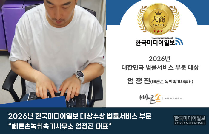 2026년 한국미디어일보 법률서비스 부문 대상 수상자로 빠른손녹취속기사무소 엄정진 대표가 선정됐다. 이번 수상은 법률 분쟁과 공적 기록의 현장에서 요구되는 신속성·정확성·약속 이행이라는 기본 원칙을 꾸준히 실천해 온 점과, 증거 중심의 기록 문화를 현장에 정착시켜 온 공로를 종합적으로 평가한 결과다.