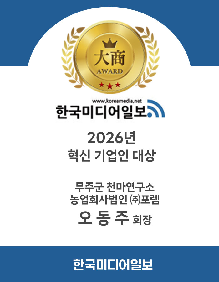 무주군 천마연구소 농업회사법인 ㈜포렘 오동주 회장이 한국미디어일보가 선정한 ‘2026 혁신 기업인 대상’을 수상했다. 이번 수상은 30여 년간 천마 연구와 재배, 산업화에 헌신하며 지역 농업의 가치를 높이고 건강 식품 산업 발전에 기여한 공로를 인정받은 결과다.