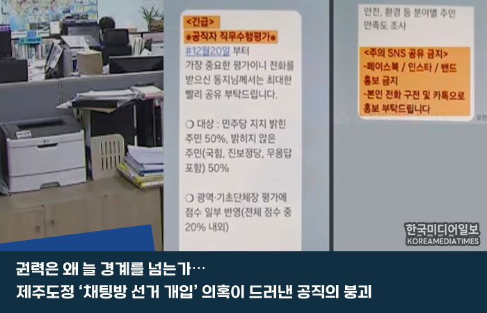 권력은 늘 스스로를 정당화한다. 그리고 그 정당화의 끝에서, 법과 원칙은 가장 먼저 희생된다. 오영훈 제주도지사 측근 공무원들의 ‘단체 채팅방 선거 개입 의혹’은 바로 그 오래된 권력의 습속이 오늘날 디지털 공간 속에서 어떻게 되고 있는지를 적나라하게 보여준다.