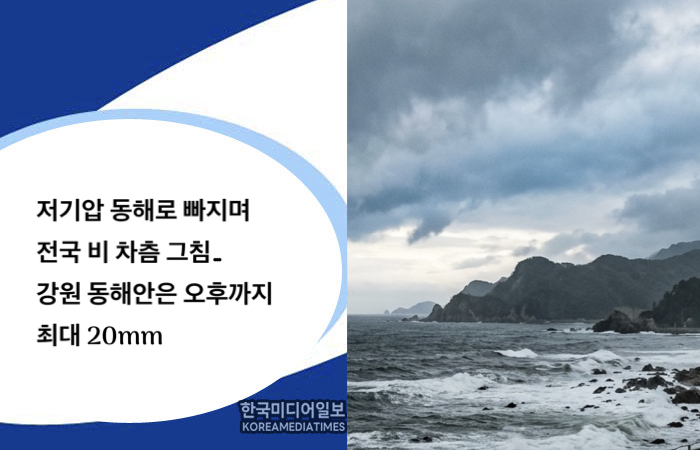 한반도를 통과하는 저기압의 영향으로 전국에 내리던 비가 저기압의 동해상 이동에 따라 오전부터 차츰 개겠다. 전국 대부분 지역에 5mm 안팎의 적은 양이 내리는 가운데, 지형적 영향을 받는 동해안은 오후까지 비가 이어지며 강수량이 20mm를 상회할 것으로 집계됐다.
