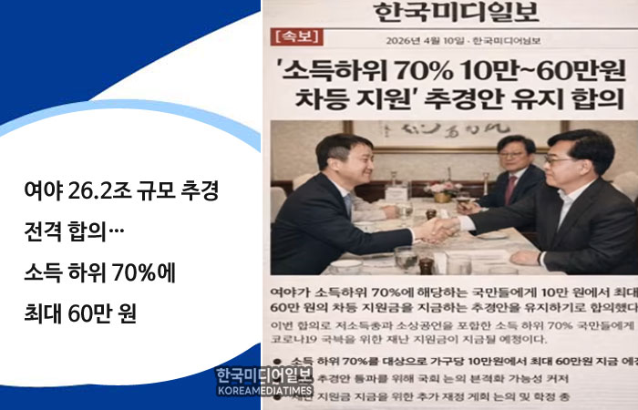 더불어민주당과 국민의힘이 소득 하위 70% 가구에 최대 60만 원의 고유가 피해지원금을 지급하는 내용을 골자로 한 26조 2천억 원 규모의 추가경정예산(추경)안에 최종 합의했다. 여야 원내지도부는 10일 오후 국회 회동을 통해 정부가 제출한 추경 총액 규모를 유지하면서도 세부 민생 예산을 증감하는 합의안을 도출했다.