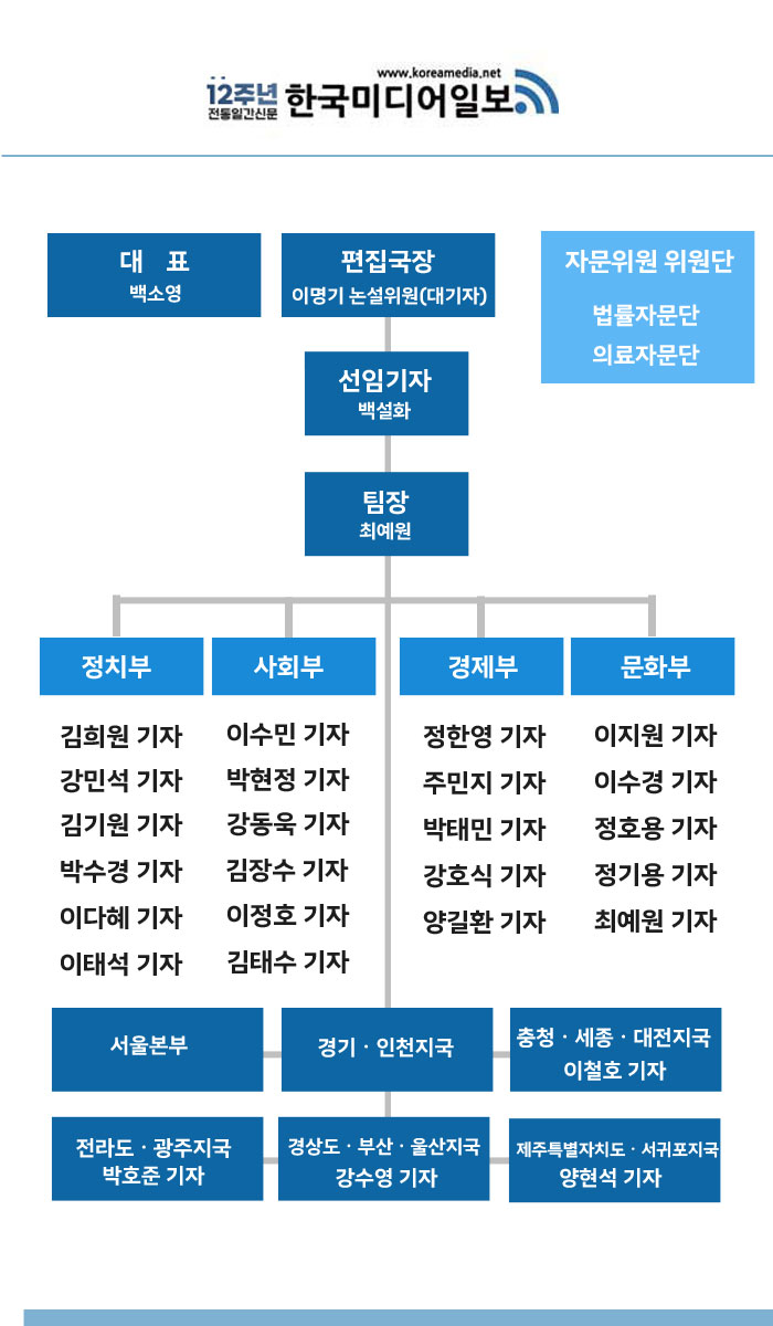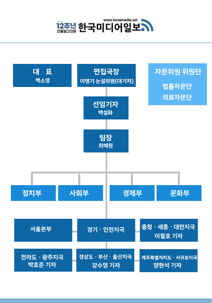 "한국미디어일보"는 12년의 전통을 가진 신문사로, 정치적, 경제적, 사회적, 문화적으로 소외된 계층을 대변하는 공정 언론사입니다. 신뢰와 정직을 바탕으로 전국 6개 네트워크를 운영하며 언론사의 사명과 책임을 다하고 있습니다.