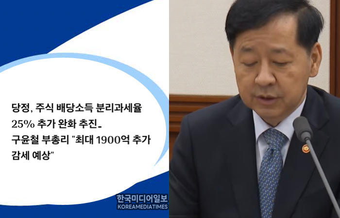 정부와 여당이 주식시장 배당 활성화를 목표로 배당소득 분리과세 최고세율을 정부안 35%에서 더불어민주당 의원안인 25%로 추가 완화하는 방안을 본격적으로 추진하고 있다. 이와 관련하여 구윤철 부..