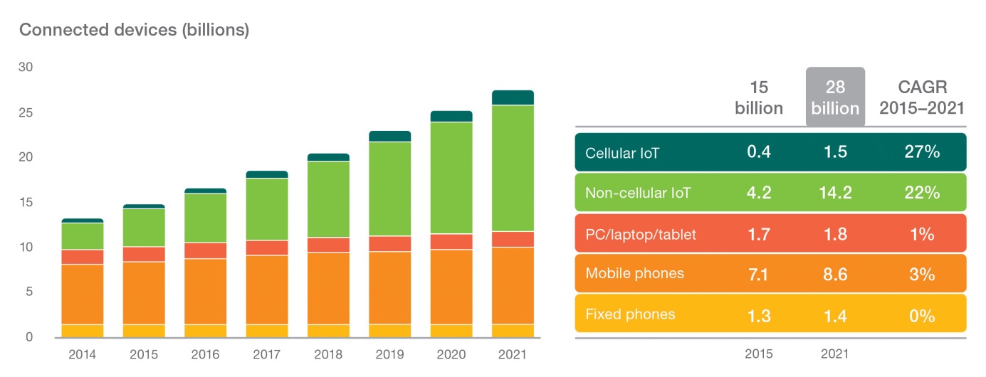 | 2015년에서 2021년 사이에 셀룰러 IoT는 가장 높은 성장률을 보일 것이며, IoT 커넥티드 기기의 수는 연평균 23%로 성장할 것으로 예상된다. 2021년까지 약 280억 개의 커넥티드 기기가 생겨나고 이 중 IoT 기기는 약 160억 개에 달할 것이다. (사진제공: 에릭슨엘지).. 최영 기자 | 07-03 16:14 |