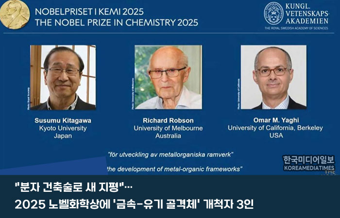 스웨덴 왕립과학원은 현지시간 8일, 2025년 노벨 화학상 수상자로 '금속-유기 골격체(Metal-Organic Frameworks, MOFs)' 분야를 개척한 일본 교토대의 기타가와 스스무 교수, 호주 멜버른대의 리처드 롭슨 교수, 그리고 미국 UC버클리의 오마르 M. 야기 교수를 공동 선정했다고 발표했다. 노벨위원회는 이들 3인이 금속 이온과 유기 분자를 결합해 다공성 결정 물질을 설계하는 "새로운 분자 건축 규칙"을 창조함으로써 화학의 지평을 넓혔다고 평가했다.