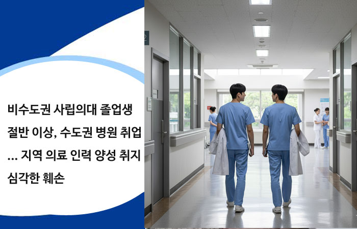 지역의료 인력 양성을 목표로 설립된 비수도권 사립대학교 의과대학의 졸업생 중 절반 이상이 수도권 병원으로 취업하는 것으로 나타나, 지방의대 설립 취지가 심각하게 훼손되고 있다는 지적이 제기된다. 2023년 기준 비수도권 사립대 의대 졸업생의 수도권 취업률은 50.7%로 집계되었으며, 이는 2019년 45.0%였던 수치에서 2022년 50.2%를 넘어선 이후 꾸준히 상승세를 이어가고 있는 현상이다. 특히 2023년 한 해 동안 비수도권 의대 졸업생 두 명 중 한 명은 수도권으로 향한 것으로, 지역 의료 공백 심화에 대한 우려가 커지고 있다.