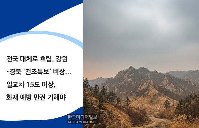 21일 금요일, 전국적으로 가끔 구름이 많은 날씨가 예상되는 가운데 강원 영동과 경북 동해안을 중심으로 대기가 매우 건조하여 산불 등 각종 화재 발생 위험이 높아질 전망이다. 또한, 중부 내륙을 중심으로 아침 기온이 다시 영하권으로 떨어지며 쌀쌀한 날씨가 이어지겠고, 낮과 밤의 기온 차가 15도 이상 크게 벌어져 건강 관리에 각별한 주의가 요구된다.기상청은 "현재 강원 동해안·산지와 경북 동해안·북동 산지를 중심으로 대기가 매우 건조한 상태"라며, 특히 강원 영동 지역을 중심으로 바람까지 강하게 불 것으로 예보했다.