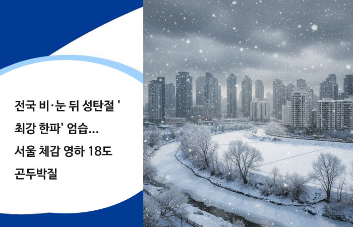 내일인 24일 아침 기온은 서울 1도, 대구 5도 등 전국 대부분 지역이 영상권으로 출발하며 큰 추위는 없겠으나, 낮부터 찬 바람이 점차 강해지기 시작하겠다. 한낮 기온은 서울 6도, 전주 8도 등으로 예보됐다. 본격적인 한파의 서막은 성탄절 당일부터 열린다. 성탄절 아침부터 기온이 급격히 하락해 서울은 종일 영하권에 머물 것으로 보이며, 특히 금요일인 26일 아침에는 서울 기온이 영하 12도까지 떨어지며 한파가 정점에 달할 것으로 분석된다. 강풍까지 동반되면서 서울의 체감 온도는 무려 영하 18도까지 곤두박질칠 것으로 보여 외출 시 방한 대책을 철저히 세워야 한다.