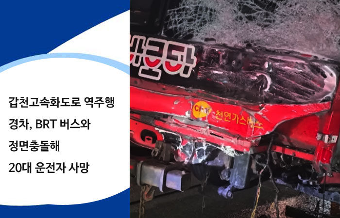 대전소방본부와 경찰에 따르면, 이날 오후 9시 39분경 대전 대덕구 와동 육교 인근 갑천도시고속도로 세종 방향 도로에서 20대 여성 A씨가 몰던 스파크 승용차가 역주행 중 마주 오던 간선급행버스(BRT)와 정면으로 부딪쳤다.