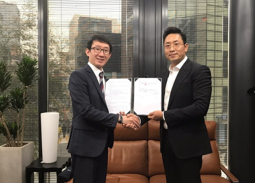 <ISMS-P 사업 계약을 체결하고 있는 이지시큐 정경섭 대표(좌), 소프트와이드시큐리티 정진 대표(우)>